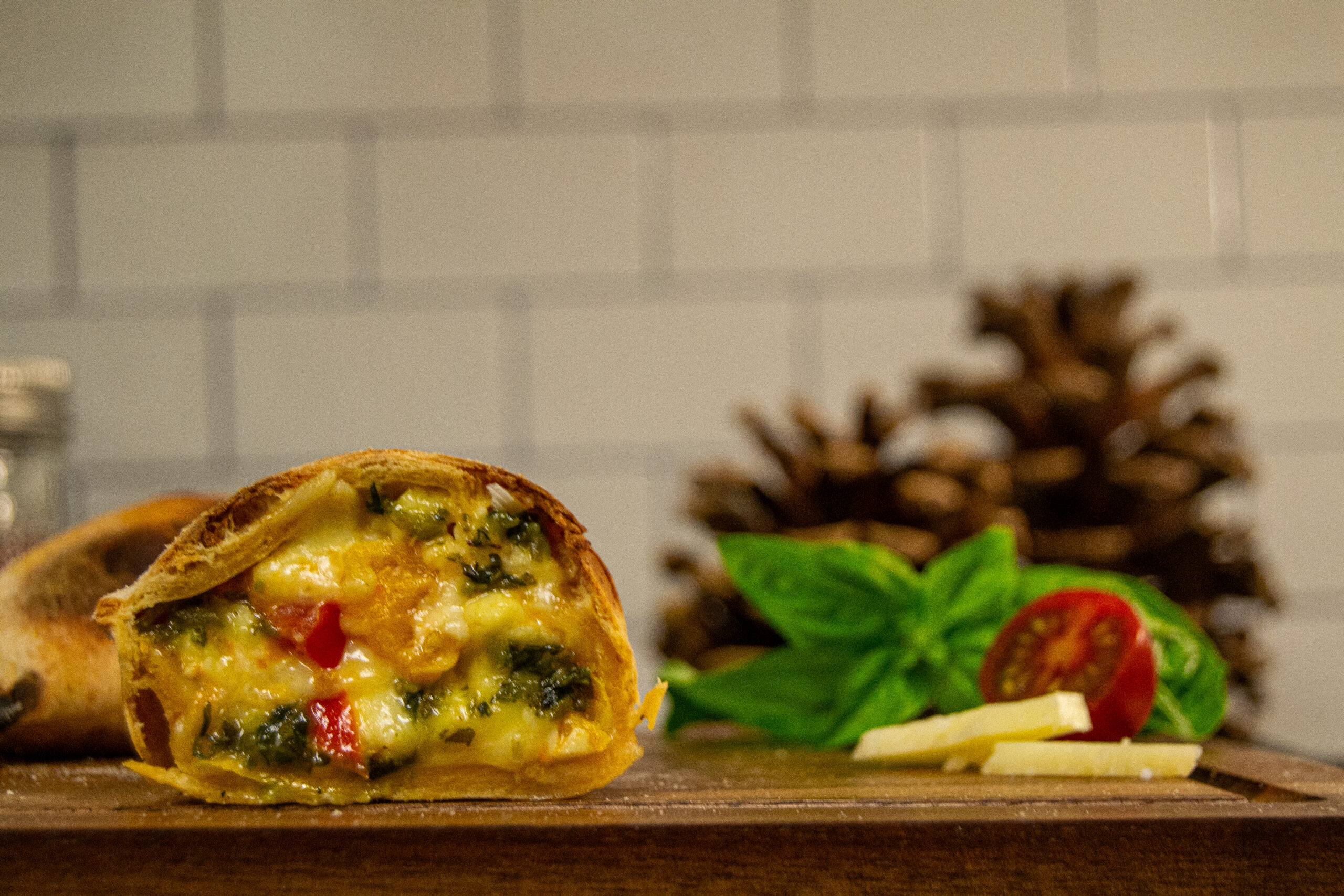 Organic roma tomatoes, pesto sauce (nut-free) organic mozzarella & pecorino romano cheese, wrapped in a wheat & coco oil dough disc.